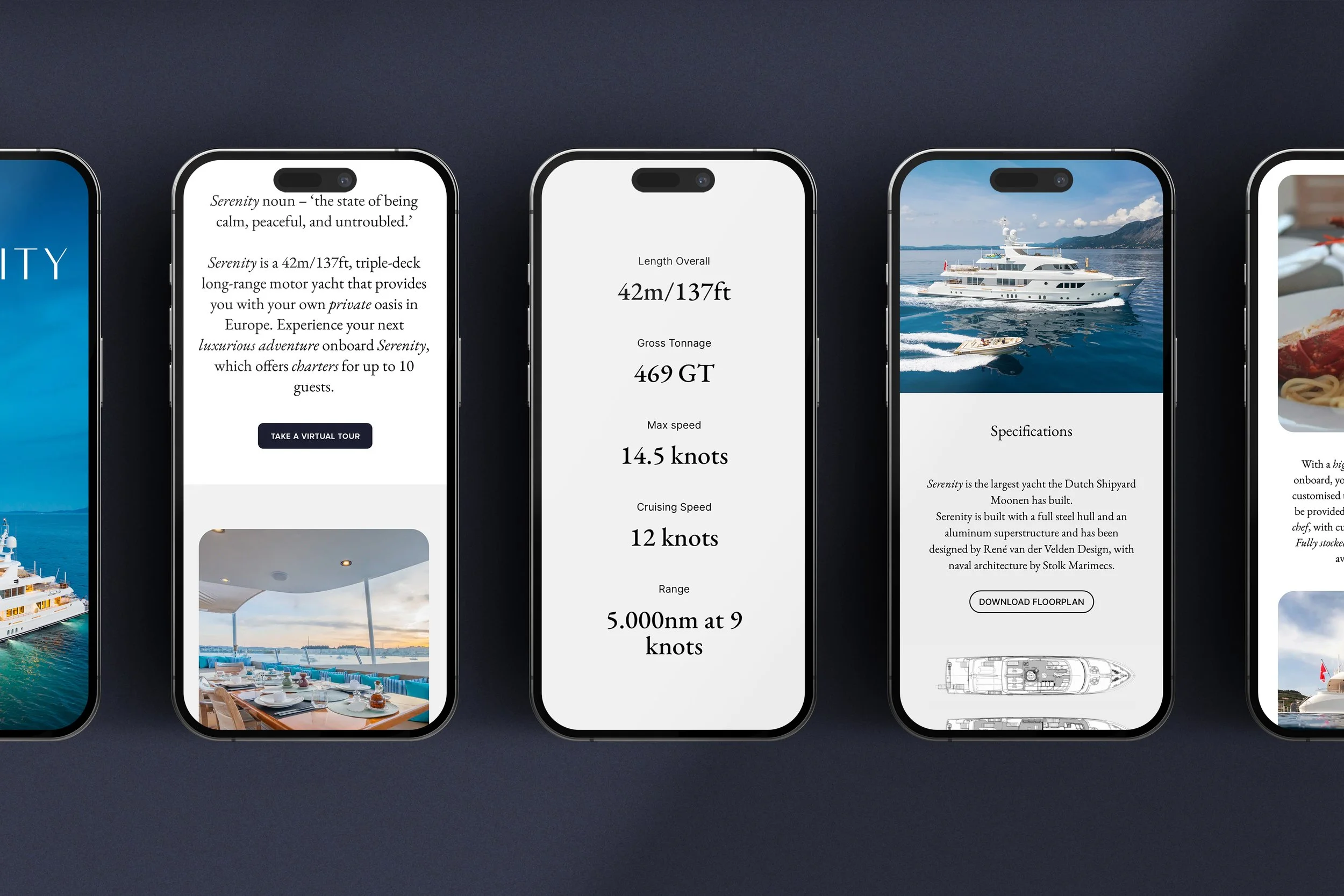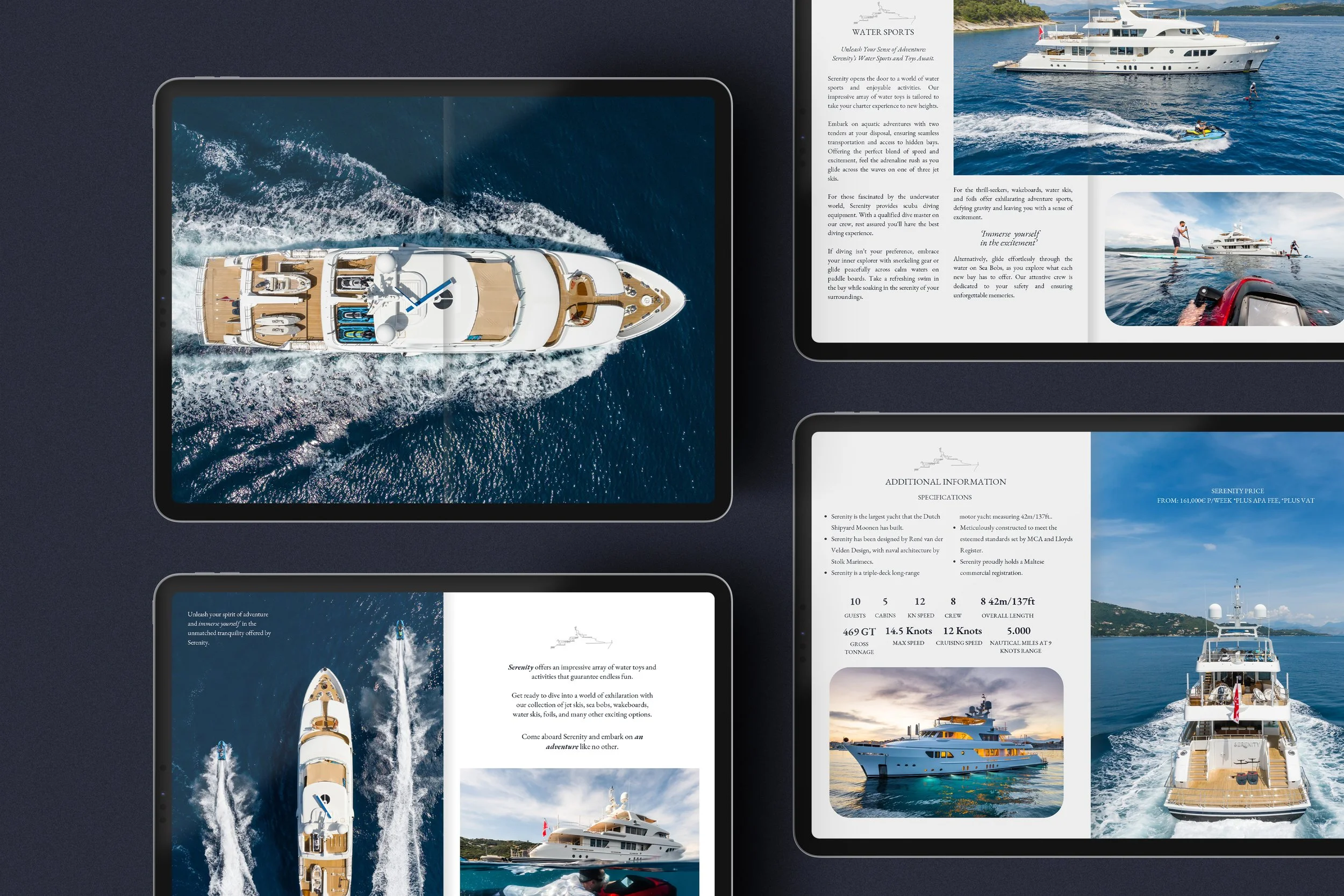 Our creative direction extended to meticulously overseeing all imagery, including managing a bespoke photoshoot on location in Europe. We carefully selected picturesque shoot locations and styled the yacht to perfection, ensuring it was photoshoot-ready. The result was a collection of stunning visuals that truly captured the essence and elegance of Serenity, showcasing its timeless beauty and luxurious appeal.