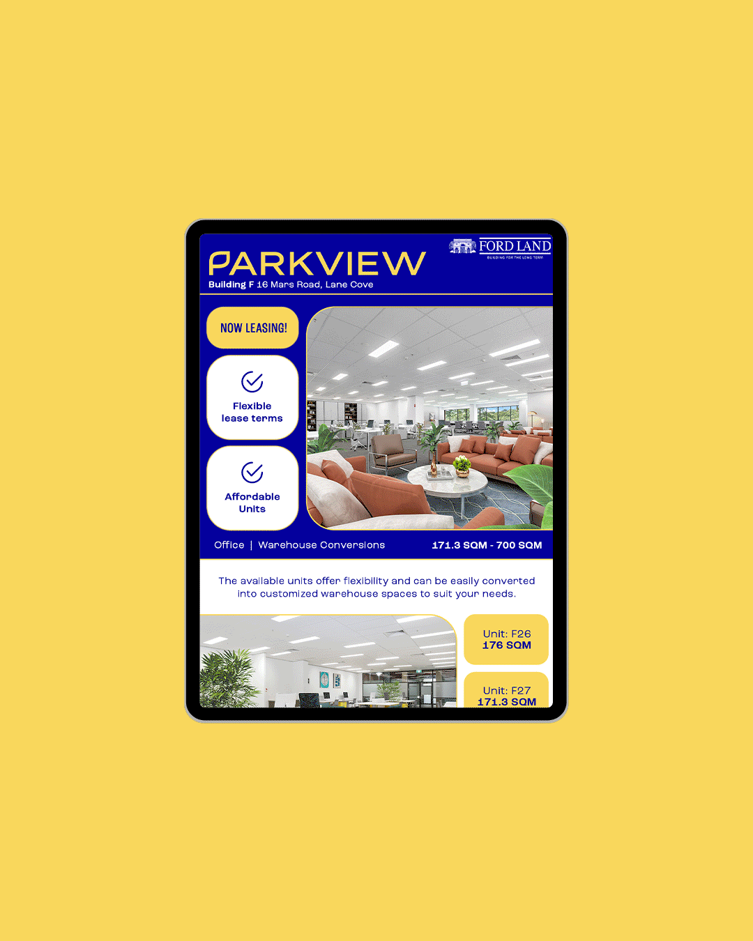 JKP Marketing launched a dynamic campaign to promote small office spaces within an Industrial site. The challenge? Leasing these units in a market that currently doesn’t favour office space. To overcome this, we gave the estate a name and a distinct identity, executed a PR campaign focused on local media, held an agent event, and used vibrant branding to make an impact. Our approach included B2B EDM campaigns, eye-catching digital and print brochures, high-quality photography with virtual furniture, and standout signage.